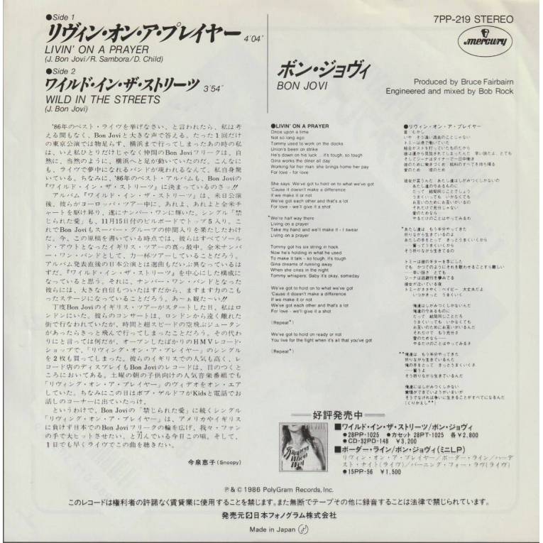 BON JOVI - LIVING ON A PRAYER / WILD IN THE STREETS